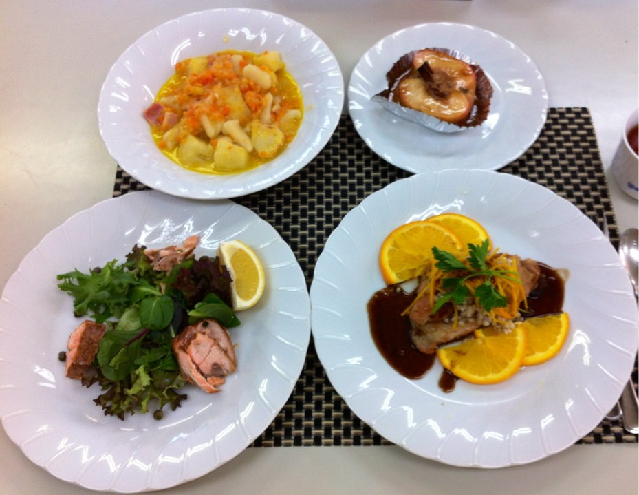 ニョッキ、サーモンのスモークソルトかけ、地鶏のソテーバルサミコソースオレンジ風味、焼き林檎