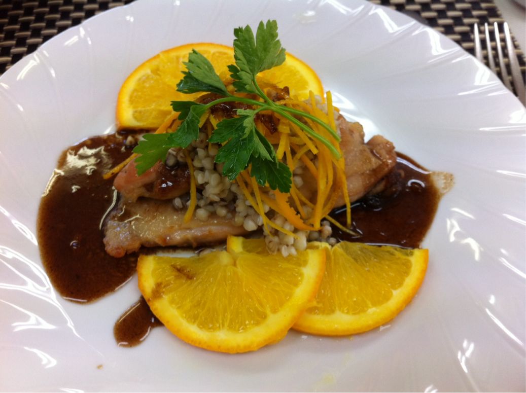 地鶏のソテーは見た目も綺麗で、とても美味しかったです。ソースはバルサミコ、オレンジ果汁、マーマレードを煮詰めて作りました。
