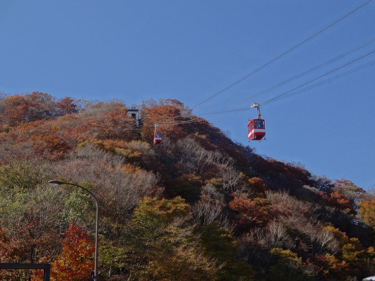 目的地の男体山の奥には雪化粧した山が見えました。馬返しの休憩所で吊りかけた脚を休ませて、先ずは、渋滞の車の列の横をスリスリと抜けて明智平まで登りました。