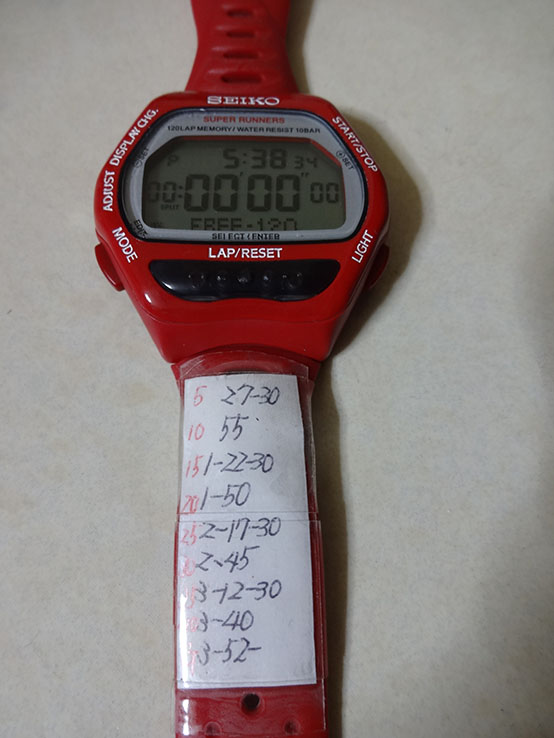 サブ4狙いで時計に予定通過タイムを貼付けて最初から飛ばしました。が、やはり後半はペースダウン。が、前半の貯金のおかげで三度目の正直で、念願のサブ4で完走出来ました。これも、一緒にマラソン・トライアスロンの練習をやってもらったお仲間のおかげです。ありがとうございます。