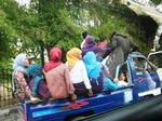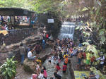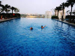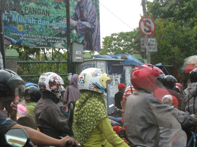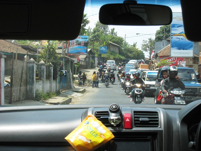 800m程離れた坂の上の空き地に駐車し、バイクを降ろして受付場所までトボトボ歩いて移動しました。受付時刻には曇り空だったお天気も、スイムが始まる頃には猛暑を思わせるお天気になってしまいました。(恐らく、「外での運動注意」の注意報が出ていたと思います)