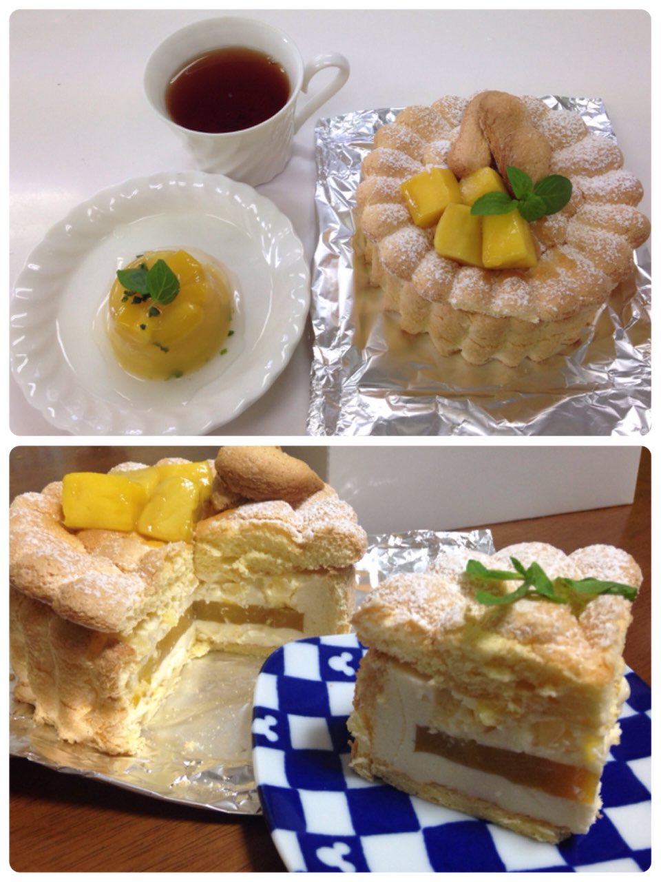 マンゴームースの中にマンゴーゼリーを入れ、焼いたビスキュイを巻いて、仕上げてあります。